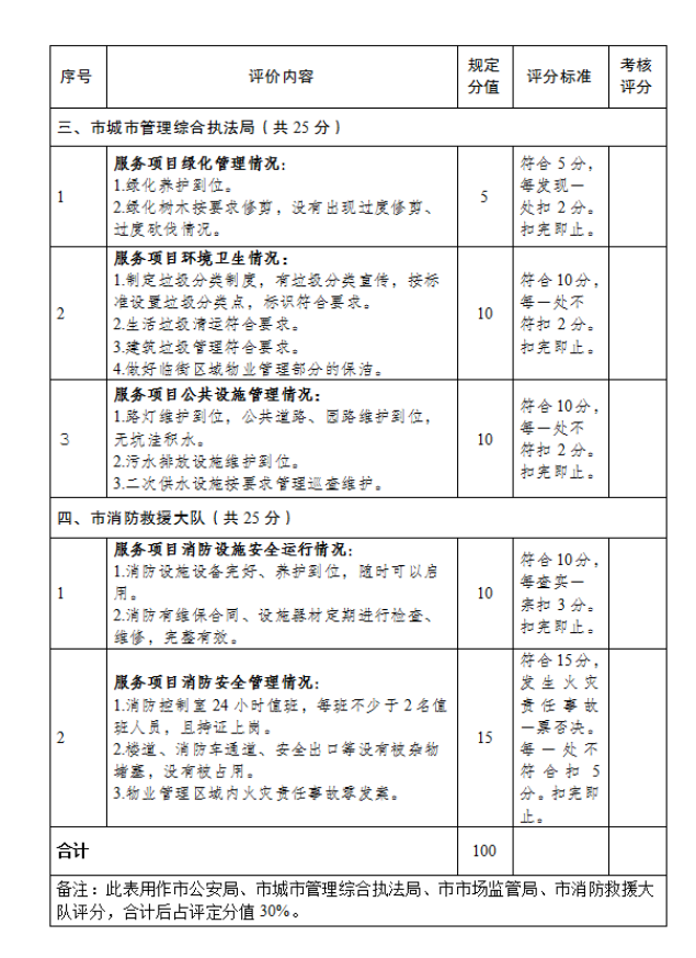 1.物業(yè)服務(wù)企業(yè)評分采用百分制,總分為100分,得分90分及以上的,評定為優(yōu)秀;得分60分及以上且不足90分的,評定為良好;得分不足60分的,評定為不合格。評分活動中,市住房城鄉(xiāng)建設(shè)局分值占比為40%,部門綜合分值占比為30%,鎮(zhèn)(街)分值占比為30%。具體評分細則詳見附件。