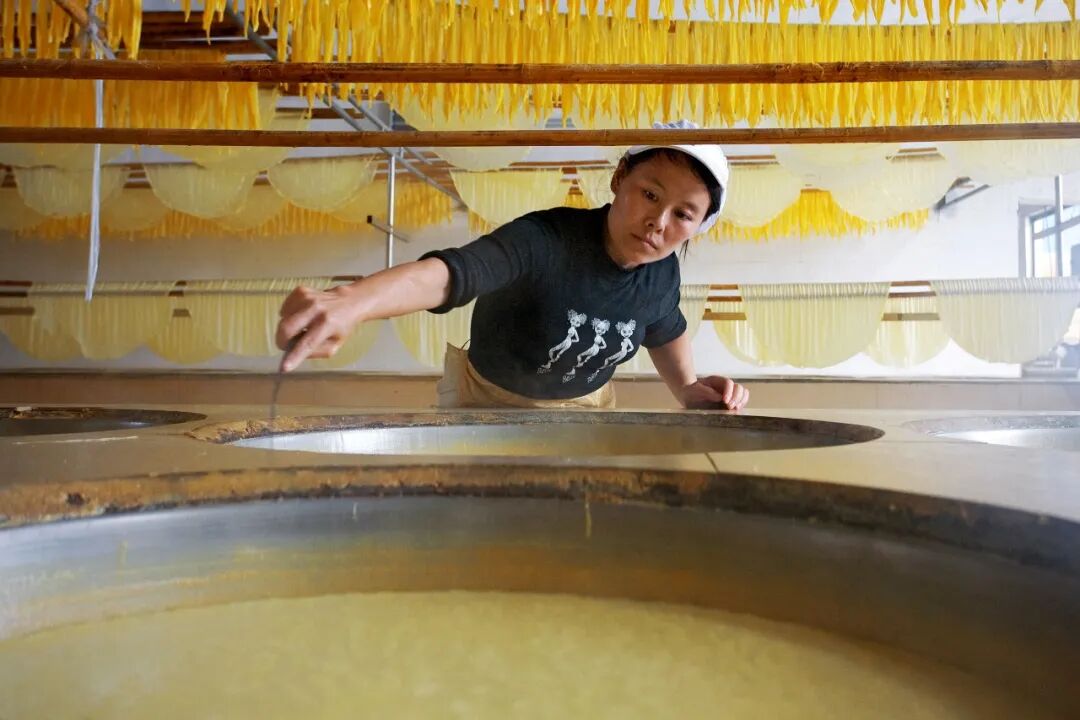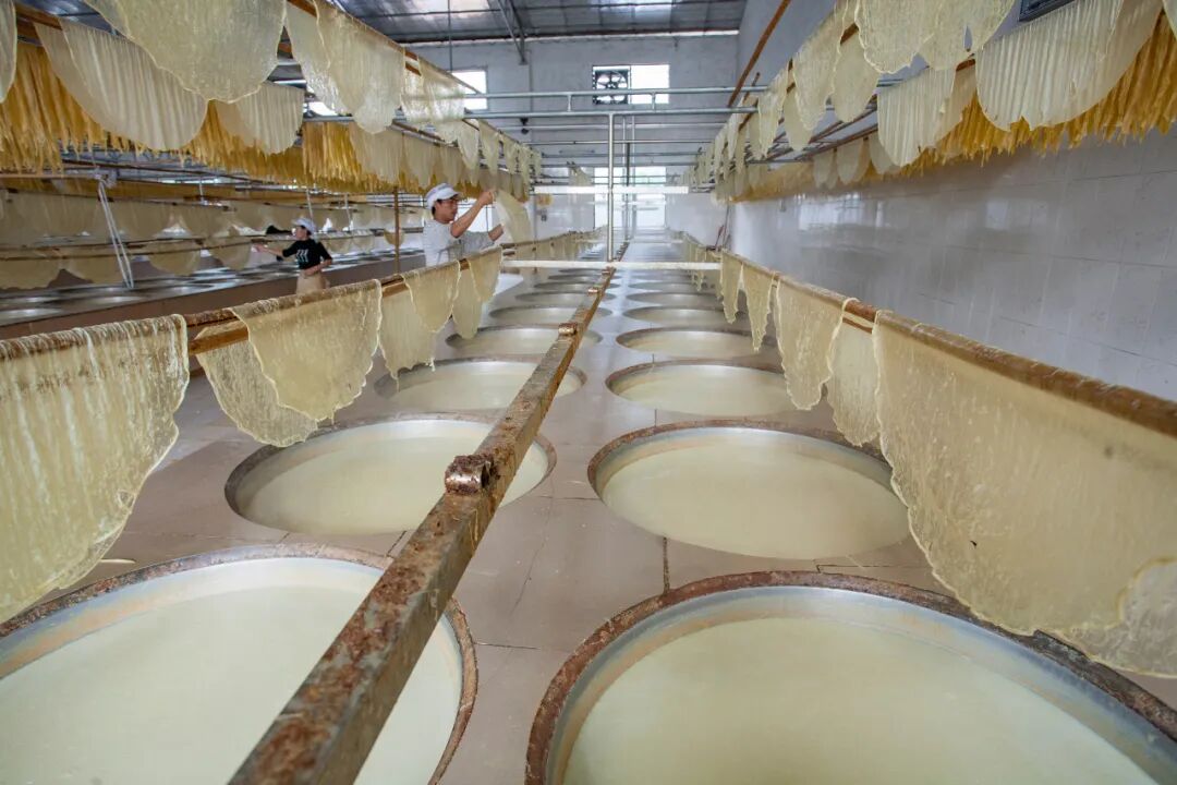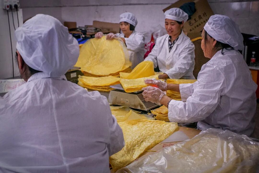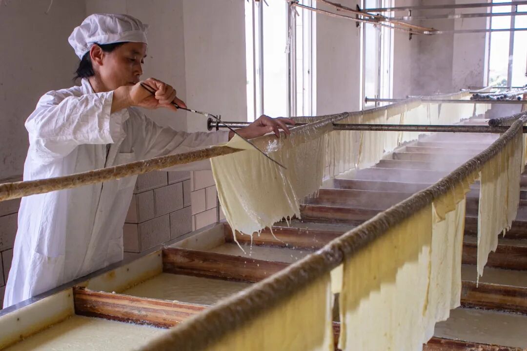 百年間,鶴城腐竹的制作工藝幾經(jīng)傳承與創(chuàng)新。在保留原來傳統(tǒng)制作工藝的基礎(chǔ)上,不斷研制新方法,現(xiàn)在鶴城腐竹的制作工藝包含了清選、浸豆、制漿、揭皮等十六道工序,制作更加精細(xì),品質(zhì)更加有保障。