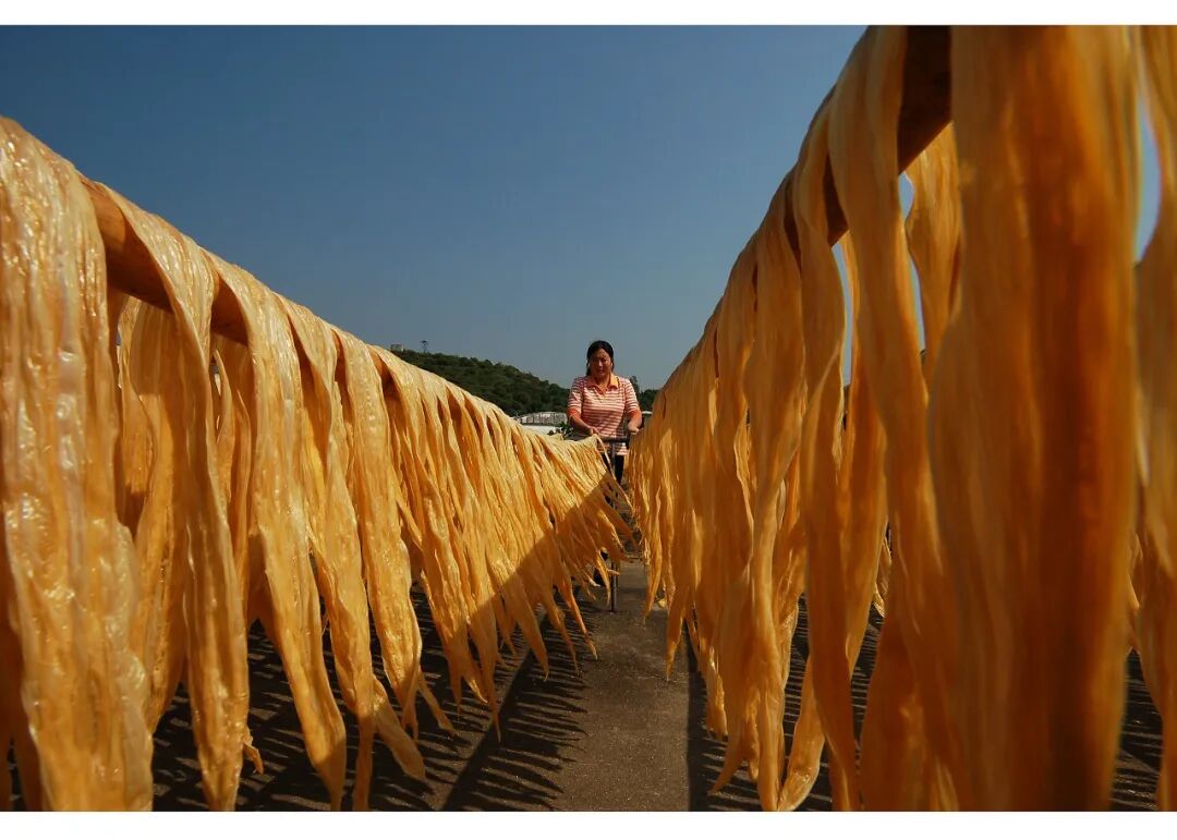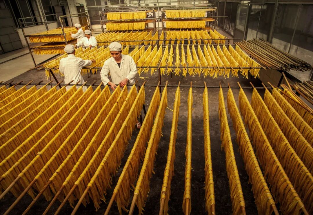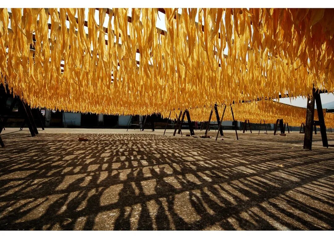 生產(chǎn)出來的腐竹放在竹竿上,在曬場靠陽光曬干或放置烘爐烘干。待腐竹表面呈黃白色、明亮透光即可。晾干、烘干后的腐竹還要加上蒸汽消毒才能進(jìn)入內(nèi)包裝和外包裝兩個工序。