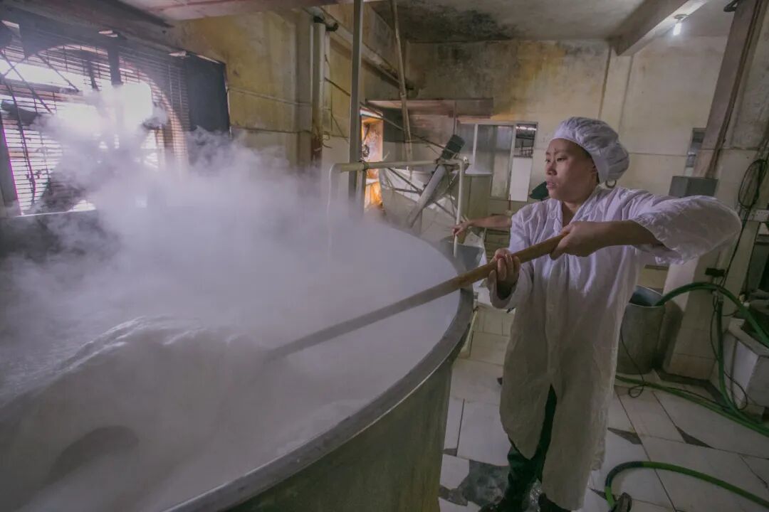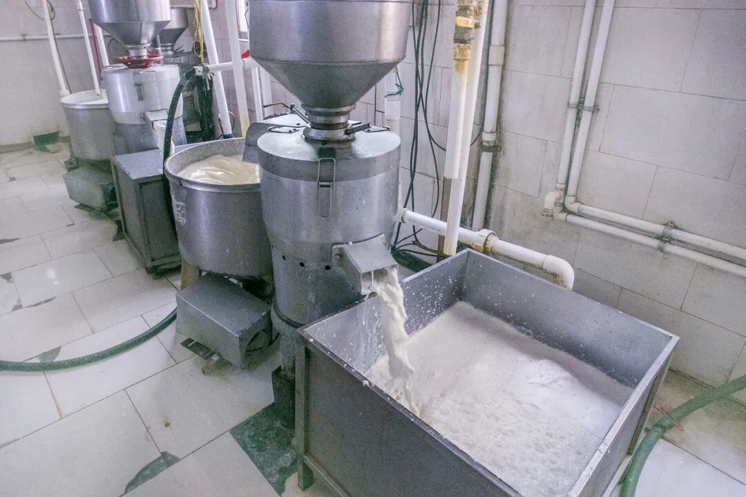 豆?jié){甩干后,由管道流入濾單,加山泉水稀釋。富含蛋白質(zhì)的豆?jié){透過旋轉(zhuǎn)不斷的濾單再注入容器,隨后用蒸汽吹漿,加熱到100~110℃。在熬制的過程中,豆?jié){會起大量浮沫,需要不停用篩子將浮沫掠去。漿汁煮熟后由管道流入篩床,再進(jìn)行1次熟漿過濾,除去雜質(zhì),這樣制出來的腐竹就不會麻麻點點。