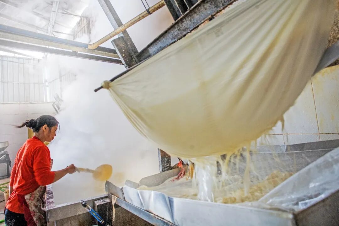 鶴城腐竹用傳統(tǒng)的石磨把黃豆磨漿,將黃豆中的營養(yǎng)成分完全提煉。再用清澈甘甜的山泉水過濾3次,以手捏豆渣松散、無漿水為標(biāo)準(zhǔn)。