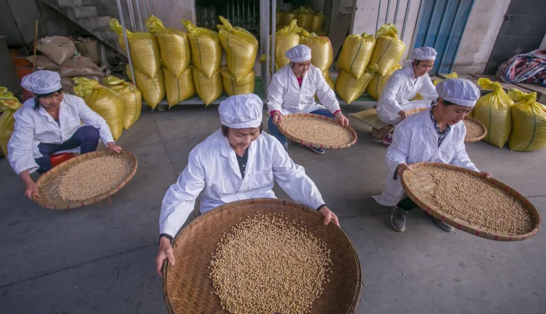 制作鶴城腐竹的黃豆要飽滿有光澤,顆粒均勻。將選好的黃豆用脫皮機粉碎去皮,保證黃豆色澤黃白,從而提高蛋白利用率和出品率。