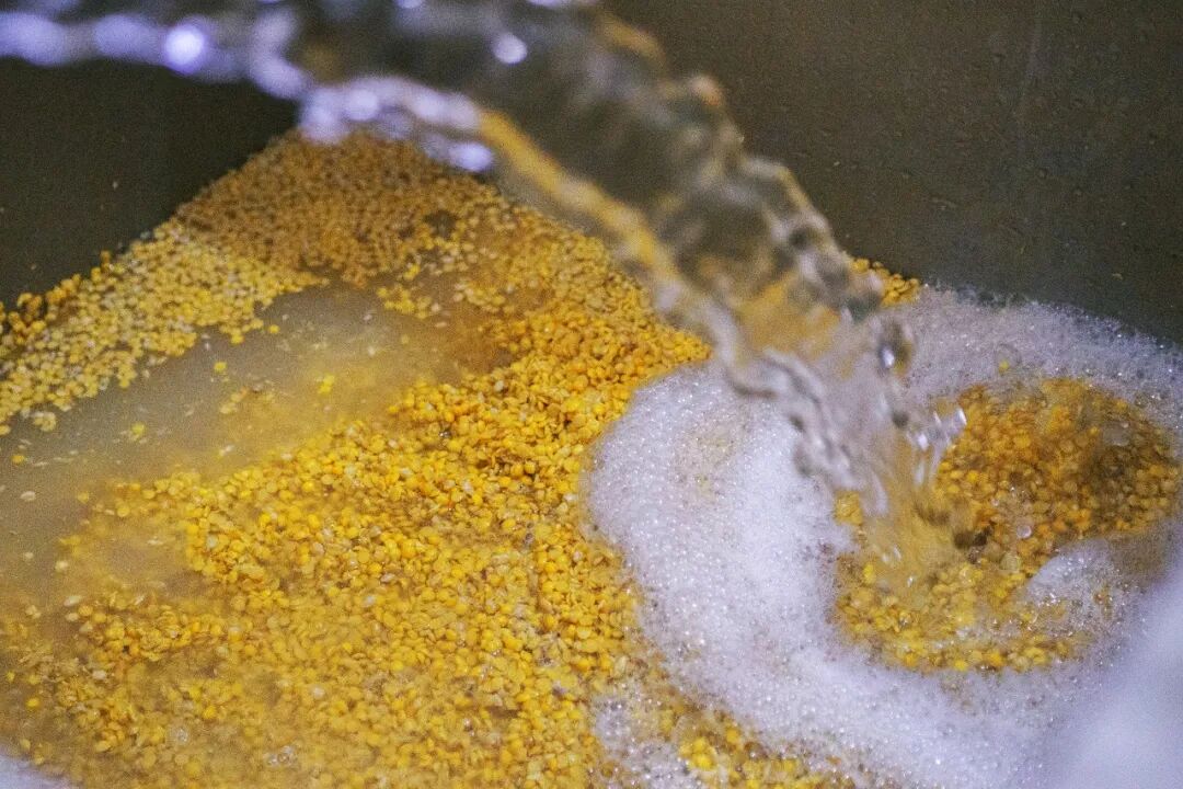 將去皮的黃豆用清水按一定的比例浸泡,還需要根據(jù)季節(jié)、氣溫來調(diào)節(jié)泡豆時間,直至手捏泡豆豉漲發(fā)硬、不松軟。