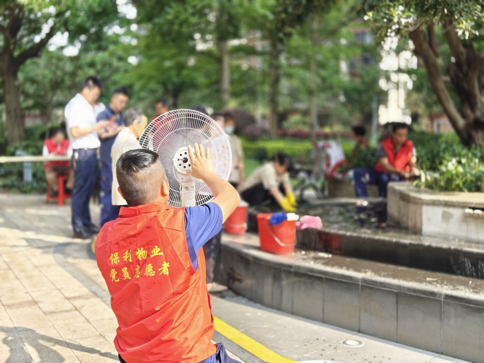 ▲南山社區(qū)發(fā)動保利小區(qū)物業(yè)管家在便民集市上免費為居民清洗風扇