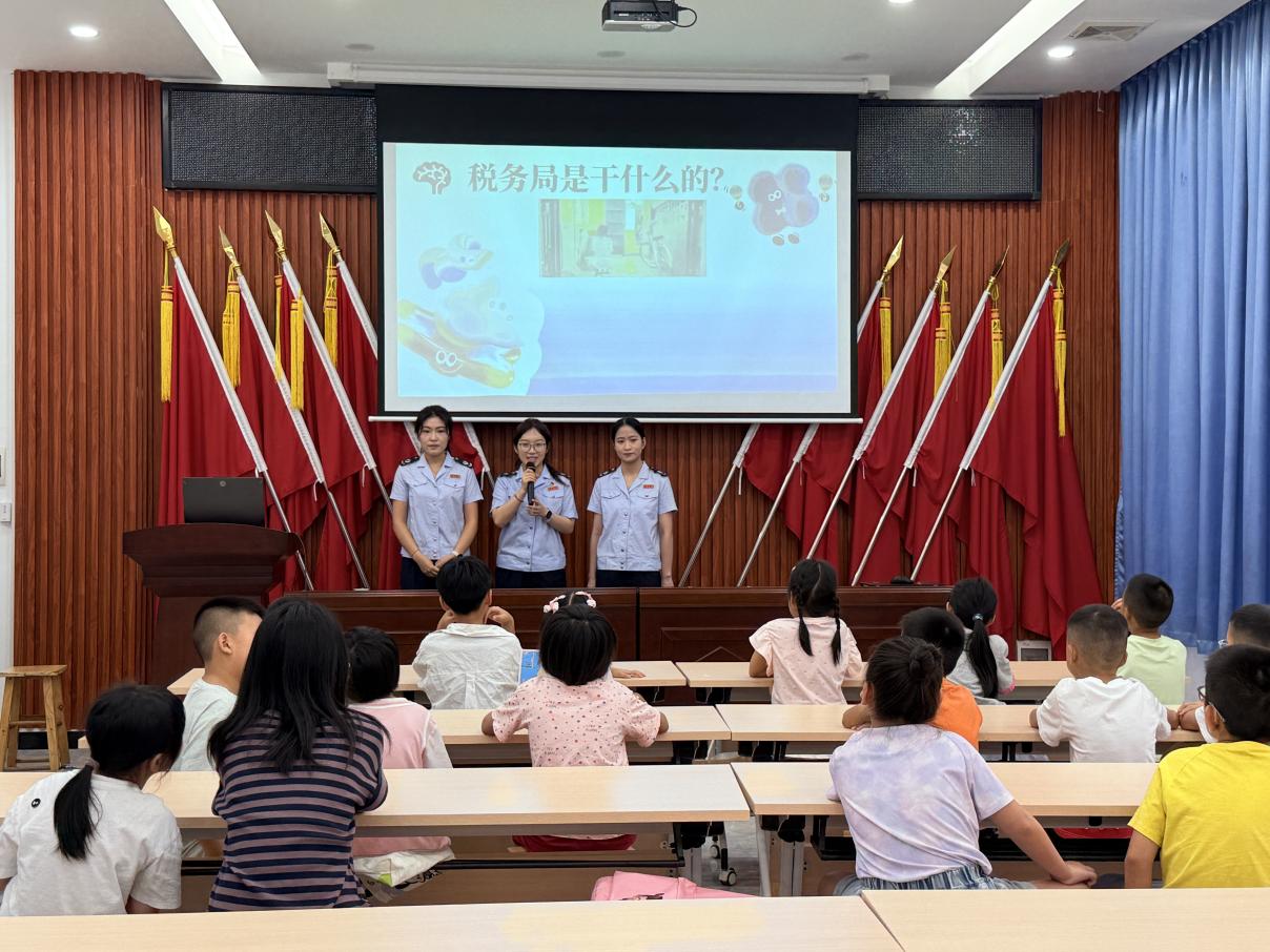 ▲8月2日,新升社區(qū)暑托班學生在鶴山市稅務局工作人員與廣東財經(jīng)大學筑夢e財實踐團的共同引領下學習稅收相關知識