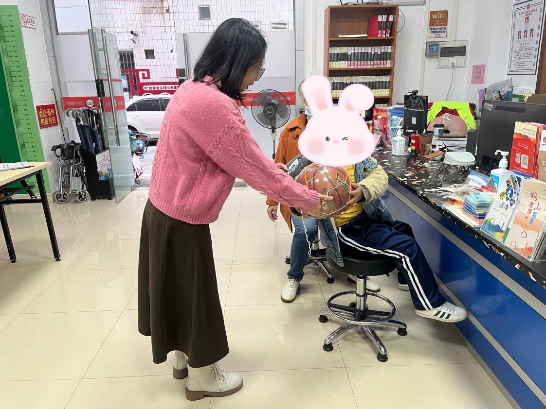 ▲東升社區(qū)工作人員將“微心愿”籃球送到孩子手中