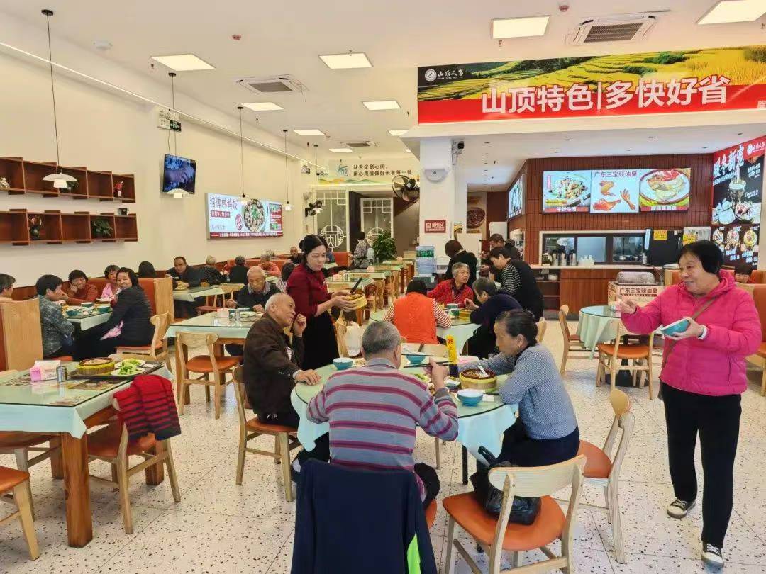 ▲沙坪街道長者飯?zhí)煤椭忘c(diǎn)內(nèi),長者們互為“飯搭子”,享受美味佳肴