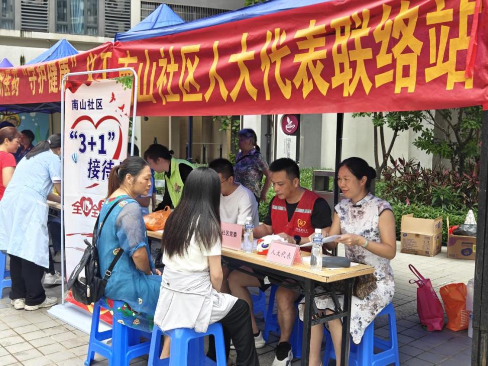 ▲南山社區(qū)在保利小區(qū)便民集市上開(kāi)展“3+1”接待日活動(dòng)